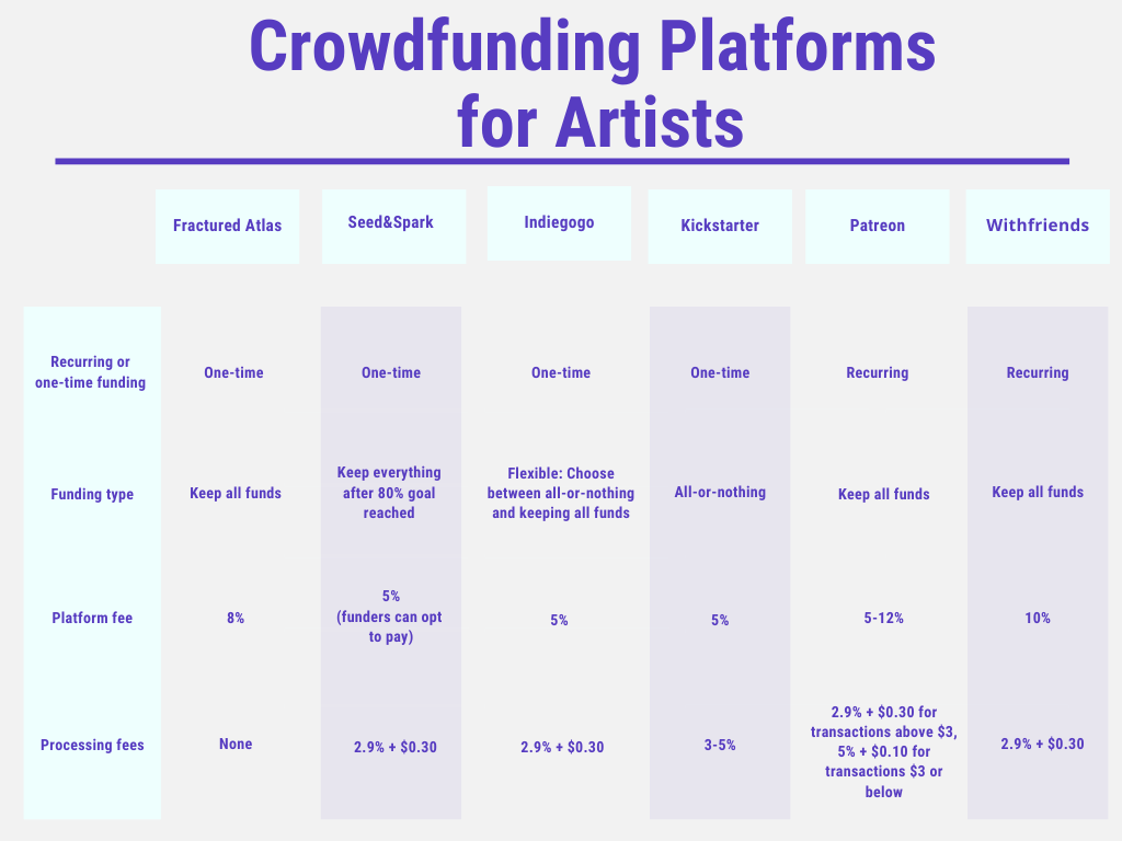 If you decide that you want to work with a crowdfunding platform that is designed specifically and exclusively for artists, Fractured Atlas’s crowdfunding platform might be the right fit.